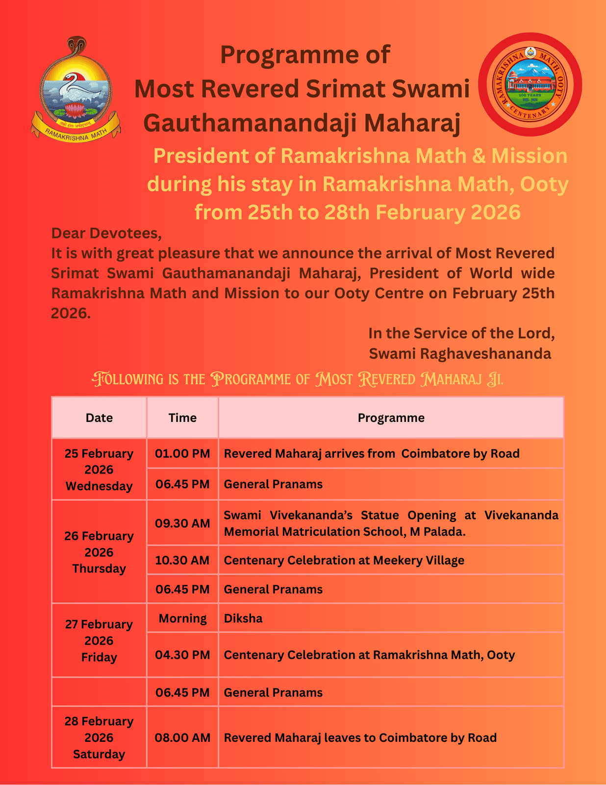 The Annual Celebration of Ramakrishna Math, Ooty will be celebrated as per the programme given below.